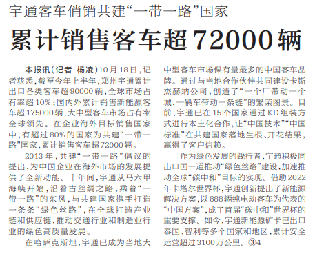 10月18日,记者获悉,截至今年上半年,郑州宇通累计出口各类客车超90000辆,全球市场占有率超10%;国内外累计销售新能源客车超175000辆,大中型客车市场占有率全球领先。在企业海外目标销售国家中,有超过80%的国家为共建“一带一路”国家,累计销售客车超72000辆。(今日《河南日报》5版)