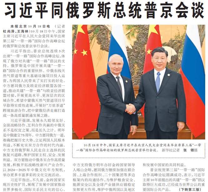 10月18日中午,国家主席习近平在人民大会堂同来华出席第三届“一带一路”国际合作高峰论坛的俄罗斯总统普京举行会谈。(今日《人民日报》1版、3版)