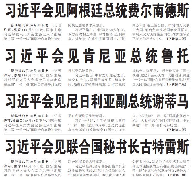 10月18日晚,国家主席习近平在人民大会堂会见来华出席第三届“一带一路”国际合作高峰论坛的联合国秘书长古特雷斯。(今日《人民日报》1版、2版)