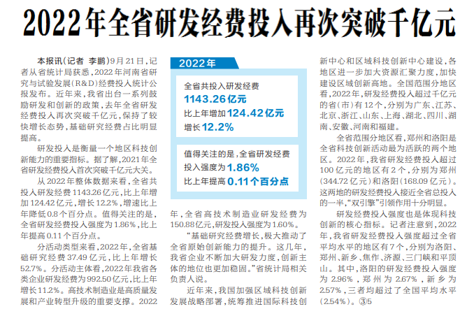 9月21日,记者从省统计局获悉,2022年河南省研究与试验发展(R&D)经费投入统计公报发布。近年来,我省出台一系列鼓励研发和创新的政策,去年全省研发经费投入再次突破千亿元,保持了较快增长态势,基础研究经费占比明显提高。(今日《河南日报》1版)