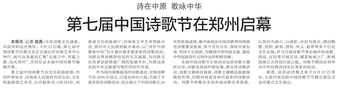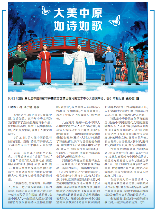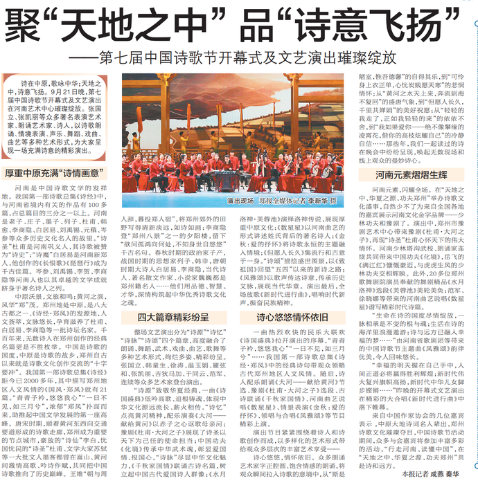 共享诗歌文化盛宴,共叙诗和远方情怀。9月21日晚,第七届中国诗歌节开幕式及文艺演出在河南艺术中心举行,吸引众多嘉宾汇聚“天地之中、华夏之源、功夫郑州”,共同见证本届中国诗歌节璀璨开幕。(今日《郑州日报》1版)