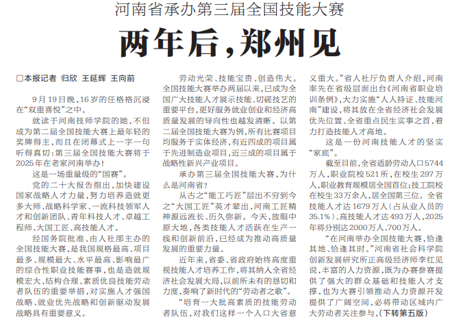就读于河南技师学院的她,不但成为第二届全国技能大赛上最年轻的奖牌得主,而且在闭幕式上一字一句听得真切:第三届全国技能大赛将于2025年在老家河南举办!(今日《河南日报》1版、5版)