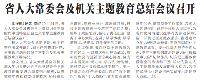 9月21日,省人大常委会及机关学习贯彻习近平新时代中国特色社会主义思想主题教育总结会议召开。(今日《河南日报》1版)