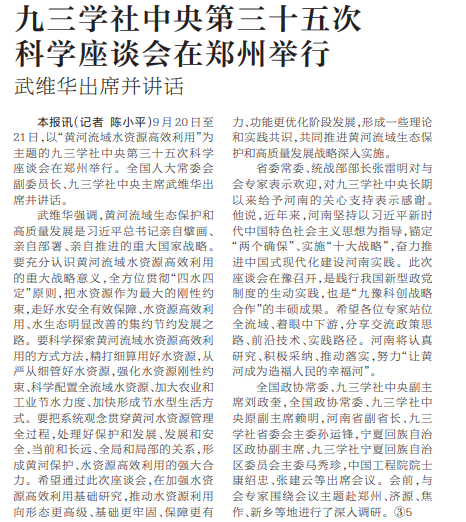 9月20日至21日,以“黄河流域水资源高效利用”为主题的九三学社中央第三十五次科学座谈会在郑州举行。全国人大常委会副委员长、九三学社中央主席武维华出席并讲话。(今日《河南日报》2版)