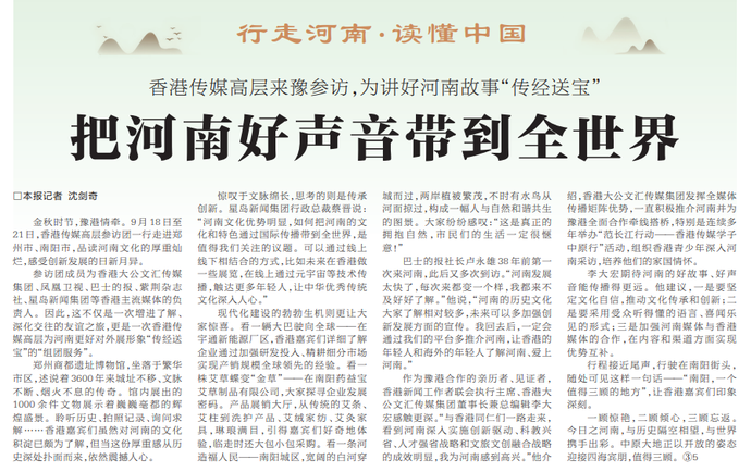 金秋时节,豫港情牵。9月18日至21日,香港传媒高层参访团一行走进郑州市、南阳市,品读河南文化的厚重灿烂,感受创新发展的日新月异。(今日《河南日报》3版)