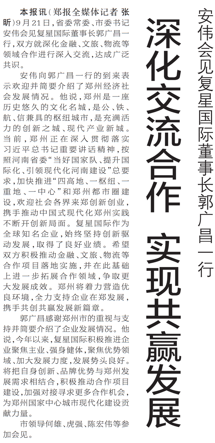 9月21日,省委常委、市委书记安伟会见复星国际董事长郭广昌一行,双方就深化金融、文旅、物流等领域合作进行深入交流,达成广泛共识。(今日《郑州日报》1版)
