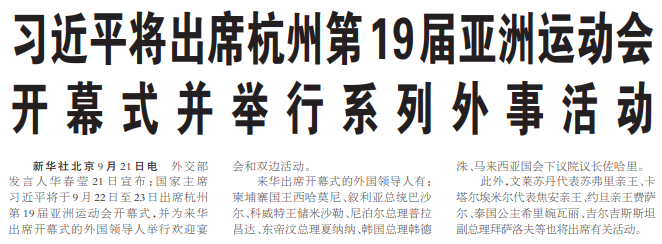外交部发言人华春莹21日宣布:国家主席习近平将于9月22日至23日出席杭州第19届亚洲运动会开幕式,并为来华出席开幕式的外国领导人举行欢迎宴会和双边活动。(今日《人民日报》1版)