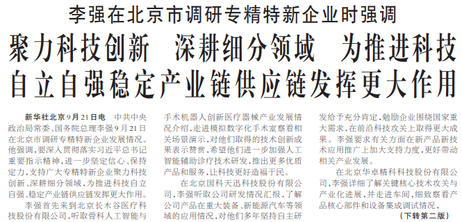 中共中央政治局常委、国务院总理李强9月21日在北京市调研专精特新企业发展情况。他强调,要深入贯彻落实习近平总书记重要指示精神,进一步坚定信心、保持定力,支持广大专精特新企业聚力科技创新、深耕细分领域,为推进科技自立自强、稳定产业链供应链发挥更大作用。(今日《人民日报》1版、2版)