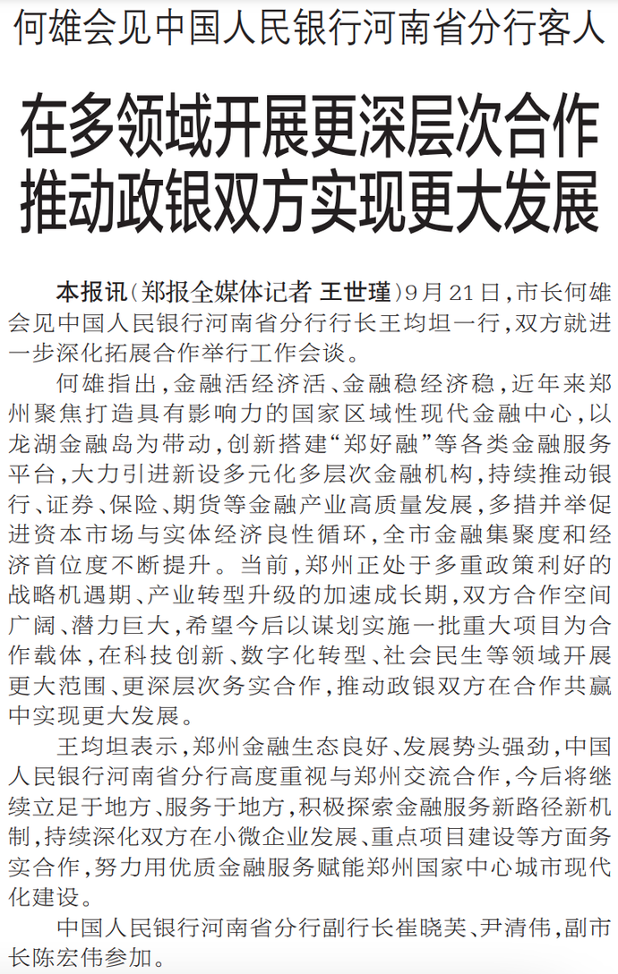 9月21日,市长何雄会见中国人民银行河南省分行行长王均坦一行,双方就进一步深化拓展合作举行工作会谈。(今日《郑州日报》1版)