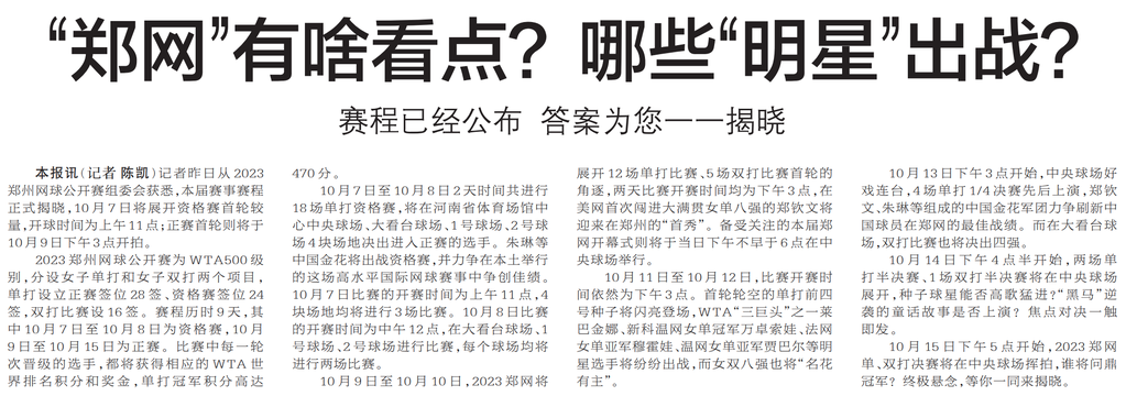 记者昨日从2023郑州网球公开赛组委会获悉,本届赛事赛程正式揭晓,10月7日将展开资格赛首轮较量,开球时间为上午11点;正赛首轮则将于10月9日下午3点开拍。(今日《郑州日报》2版)