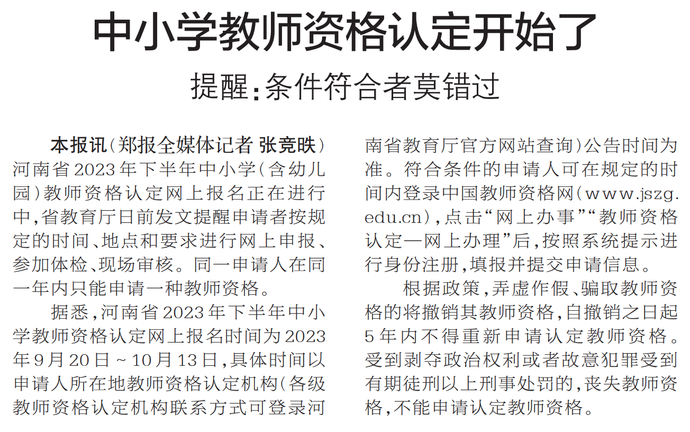 河南省2023年下半年中小学(含幼儿园)教师资格认定网上报名正在进行中,省教育厅日前发文提醒申请者按规定的时间、地点和要求进行网上申报、参加体检、现场审核。同一申请人在同一年内只能申请一种教师资格。(今日《郑州日报》2版)