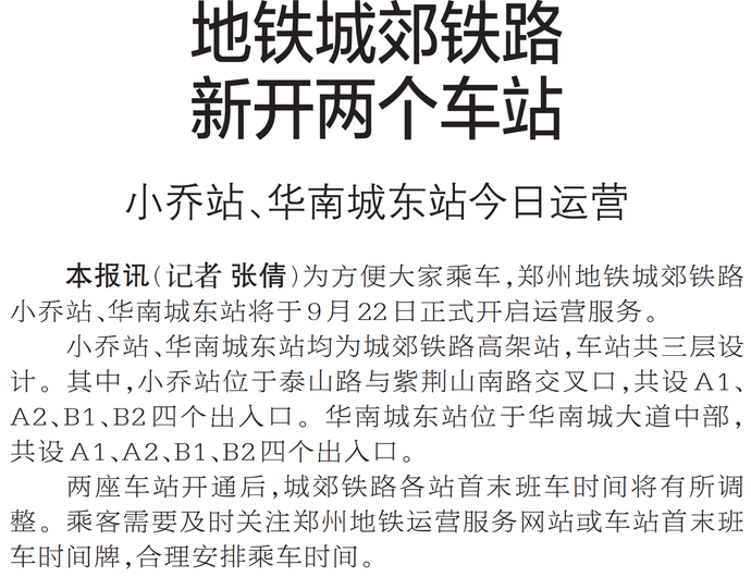 为方便大家乘车,郑州地铁城郊铁路小乔站、华南城东站将于9月22日正式开启运营服务。(今日《郑州日报》2版)