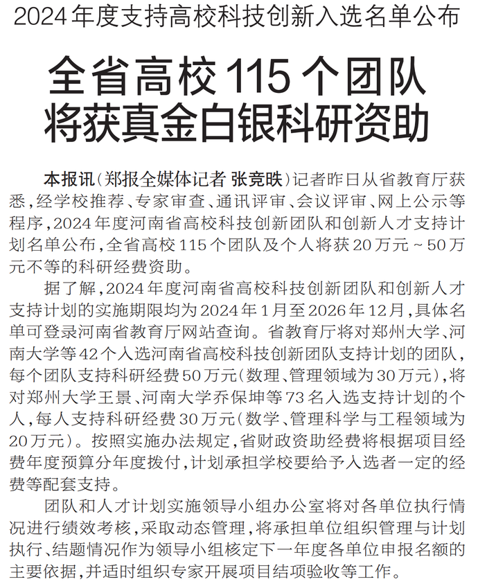 记者昨日从省教育厅获悉,经学校推荐、专家审查、通讯评审、会议评审、网上公示等程序,2024年度河南省高校科技创新团队和创新人才支持计划名单公布,全省高校115个团队及个人将获20万元~50万元不等的科研经费资助。(今日《郑州日报》2版)