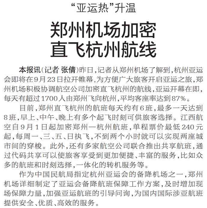 昨日,记者从郑州机场了解到,杭州亚运会即将在9月23日拉开帷幕,为方便广大旅客开启亚运之旅,郑州机场积极协调航空公司加密直飞杭州的航线,亚运开幕在即,每天有超过1700人由郑州飞向杭州,平均客座率达到87%。(今日《郑州日报》2版)