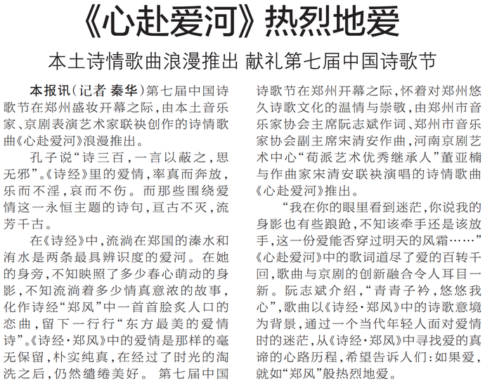 第七届中国诗歌节在郑州盛妆开幕之际,由本土音乐家、京剧表演艺术家联袂创作的诗情歌曲《心赴爱河》浪漫推出。(今日《郑州日报》5版)