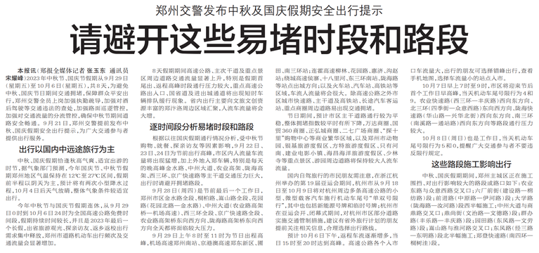 郑州交警发布中秋及国庆假期安全出行提示