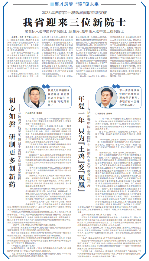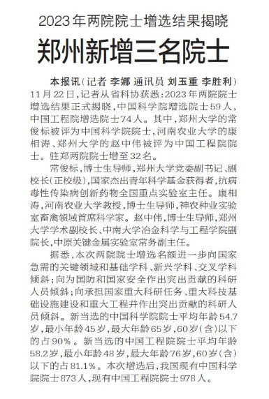 11月22日,记者从省科协获悉:2023年两院院士增选结果正式揭晓,中国科学院增选院士59人,中国工程院增选院士74人。其中,郑州大学的常俊标被评为中国科学院院士,河南农业大学的康相涛、郑州大学的赵中伟被评为中国工程院院士。驻郑两院院士增至32名。(今日《郑州日报》1版)