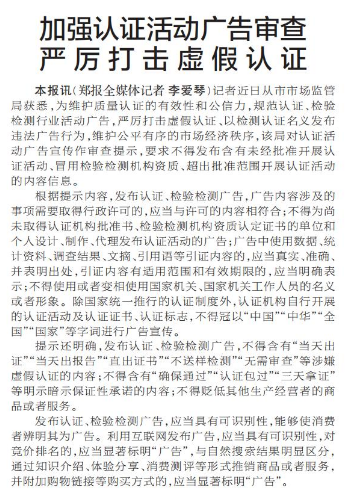 加强认证活动广告审查 严厉打击虚假认证