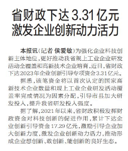 为强化企业科技创新主体地位,更好推动我省规上工业企业研发活动全覆盖和高新技术企业培育,近日,省财政下达2023年企业创新引导专项资金3.31亿元。(今日《郑州日报》2版)
