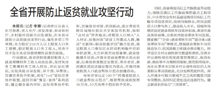 记者昨日从省人社厅获悉,省人社厅、省发改委、农业农村厅、乡村振兴局联合印发通知,在全省开展防止返贫就业攻坚行动,强化多项工作举措,全力稳定210万人以上脱贫人口务工规模,稳定脱贫人口务工收入,坚决守住不发生失业导致规模性返贫的底线。(今日《郑州日报》2版)