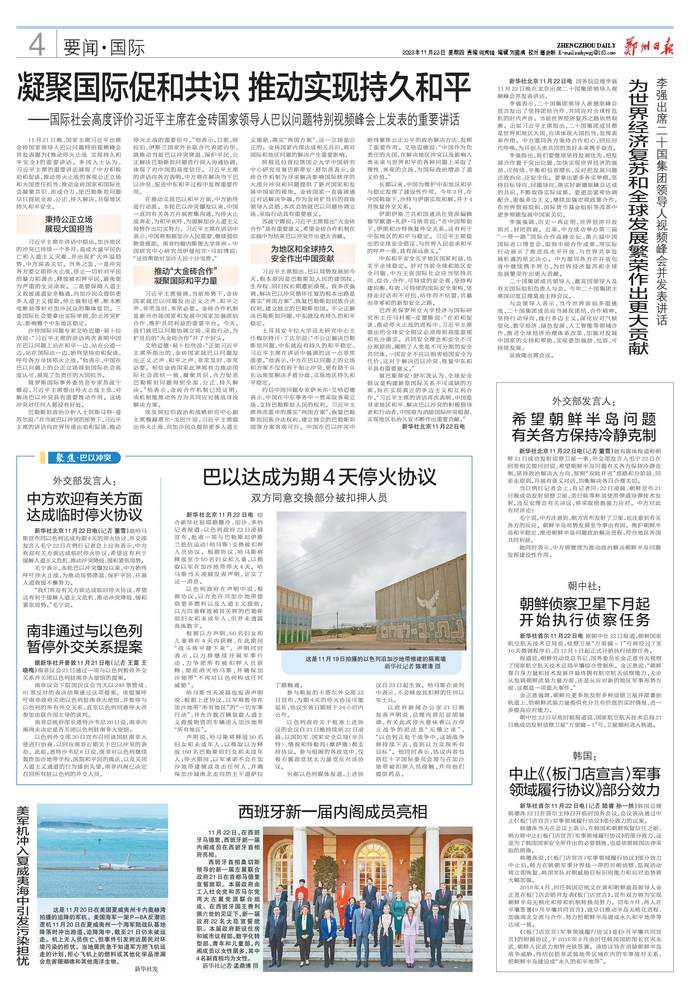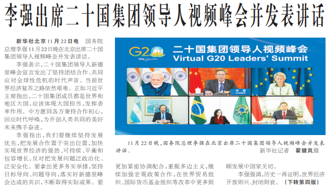 国务院总理李强11月22日晚在北京出席二十国集团领导人视频峰会并发表讲话。(今日《人民日报》1版、4版)