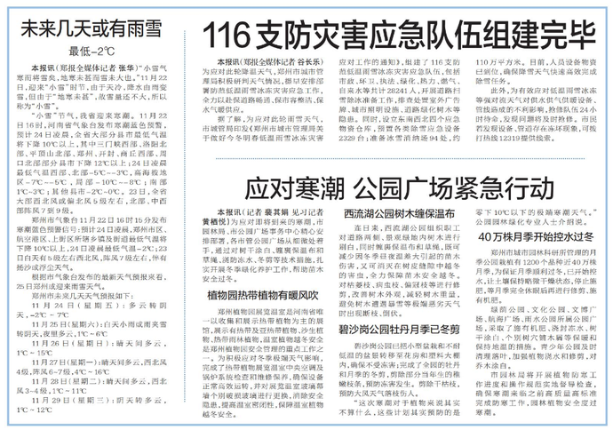 为应对此轮降温天气,郑州市城市管理局积极研判天气情况,提早安排部署防范低温雨雪冰冻灾害应急工作,全力以赴保道路畅通、保市容整洁、保水气暖供应。(今日《郑州日报》5版)