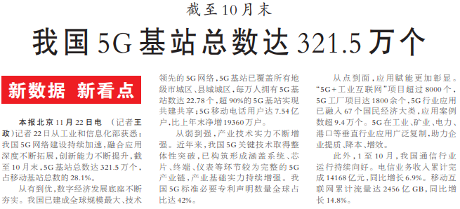 记者22日从工业和信息化部获悉:我国5G网络建设持续加速,融合应用深度不断拓展,创新能力不断提升,截至10月末,5G基站总数达321.5万个,占移动基站总数的28.1%。(今日《人民日报》1版)