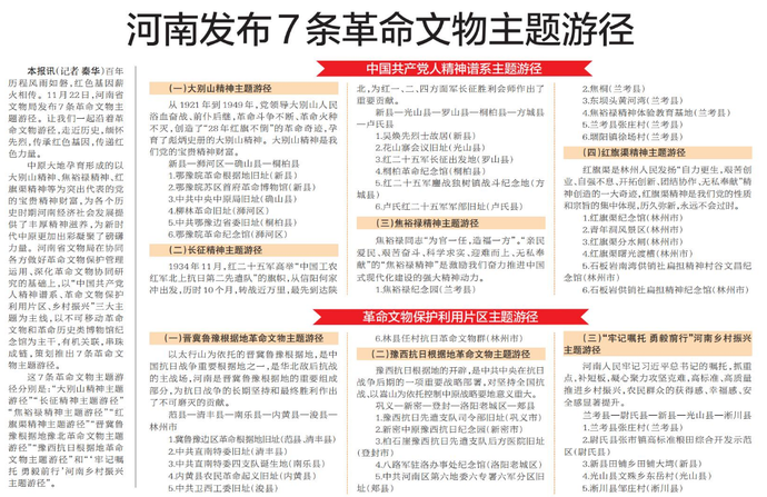 百年历程风雨如磐,红色基因薪火相传。11月22日,河南省文物局发布7条革命文物主题游径。让我们一起沿着革命文物游径,走近历史,缅怀先烈,传承红色基因,传递红色力量。(今日《郑州日报》5版)