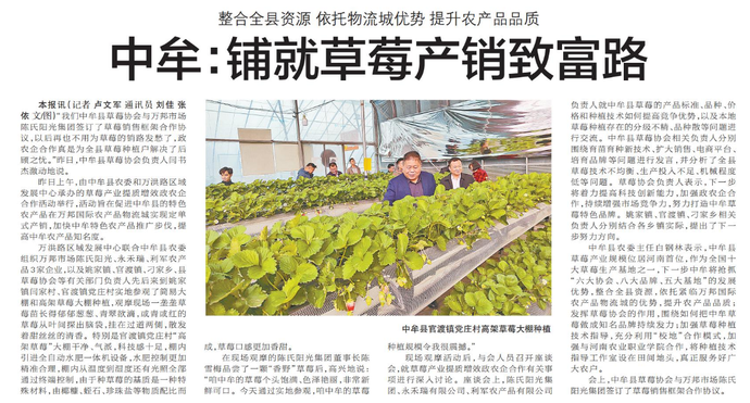 “我们中牟县草莓协会与万邦市场陈氏阳光集团签订了草莓销售框架合作协议,以后再也不用为草莓的销路发愁了,政农企合作真是为全县草莓种植户解决了后顾之忧。”昨日,中牟县草莓协会负责人闫书杰激动地说。(今日《郑州日报》7版)
