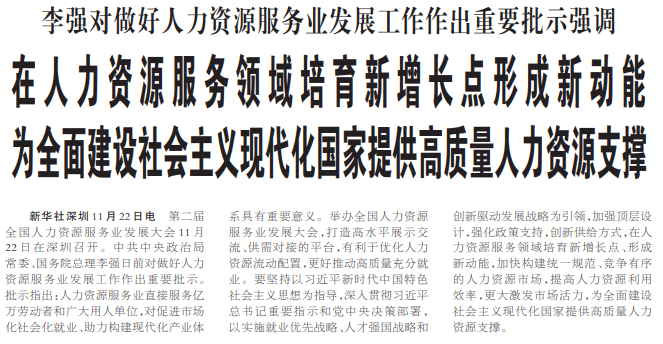 第二届全国人力资源服务业发展大会11月22日在深圳召开。中共中央政治局常委、国务院总理李强日前对做好人力资源服务业发展工作作出重要批示。批示指出:人力资源服务业直接服务亿万劳动者和广大用人单位,对促进市场化社会化就业、助力构建现代化产业体系具有重要意义。举办全国人力资源服务业发展大会,打造高水平展示交流、供需对接的平台,有利于优化人力资源流动配置,更好推动高质量充分就业。要坚持以习近平新时代中国特色社会主义思想为指导,深入贯彻习近平总书记重要指示和党中央决策部署,以实施就业优先战略、人才强国战略和创新驱动发展战略为引领,加强顶层设计,强化政策支持,创新供给方式,在人力资源服务领域培育新增长点、形成新动能,加快构建统一规范、竞争有序的人力资源市场,提高人力资源利用效率,更大激发市场活力,为全面建设社会主义现代化国家提供高质量人力资源支撑。(今日《人民日报》3版)