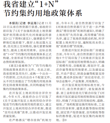 记者11月22日从省自然资源厅获悉,省政府日前印发了《关于加强和改进土地资源保护利用推动现代化河南建设的意见》,强调要在严守耕地红线前提下,做好土地这篇大文章,优化国土空间格局,强化要素保障能力,提高土地利用效率。这标志我省“1+N”节约集约用地政策体系正式构建,全省形成节约集约用地的良好态势和浓厚氛围。(今日《河南日报》3版)