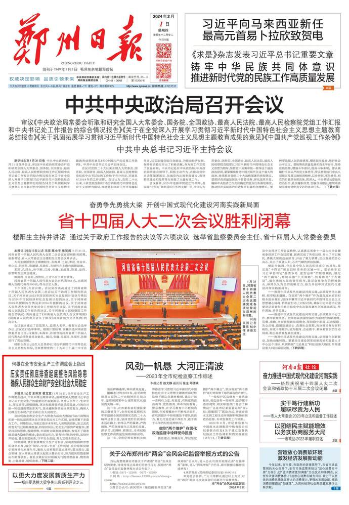 1月31日,全市安全生产工作调度会召开,市长何雄出席并讲话,强调要深入贯彻习近平总书记关于安全生产的重要论述重要指示,坚持人民至上、生命至上,压实责任、落细措施,坚决彻底排查消除风险隐患,有效应对新一轮低温雨雪冰冻天气,坚决遏制各类安全事故发生,确保人民群众生命财产安全和社会大局稳定。(今日《郑州日报》1版、2版)