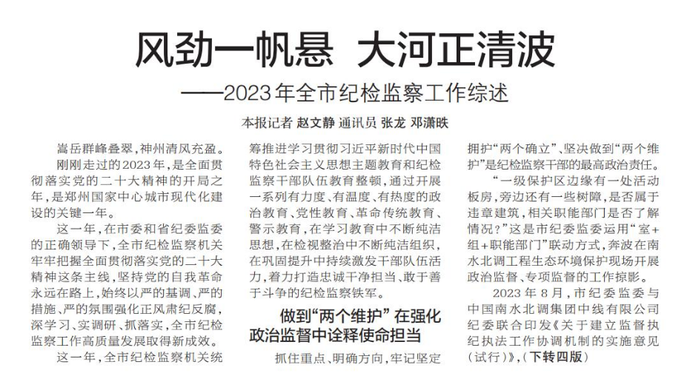 这一年,在市委和省纪委监委的正确领导下,全市纪检监察机关牢牢把握全面贯彻落实党的二十大精神这条主线,坚持党的自我革命永远在路上,始终以严的基调、严的措施、严的氛围强化正风肃纪反腐,深学习、实调研、抓落实,全市纪检监察工作高质量发展取得新成效。(今日《郑州日报》1版、4版)
