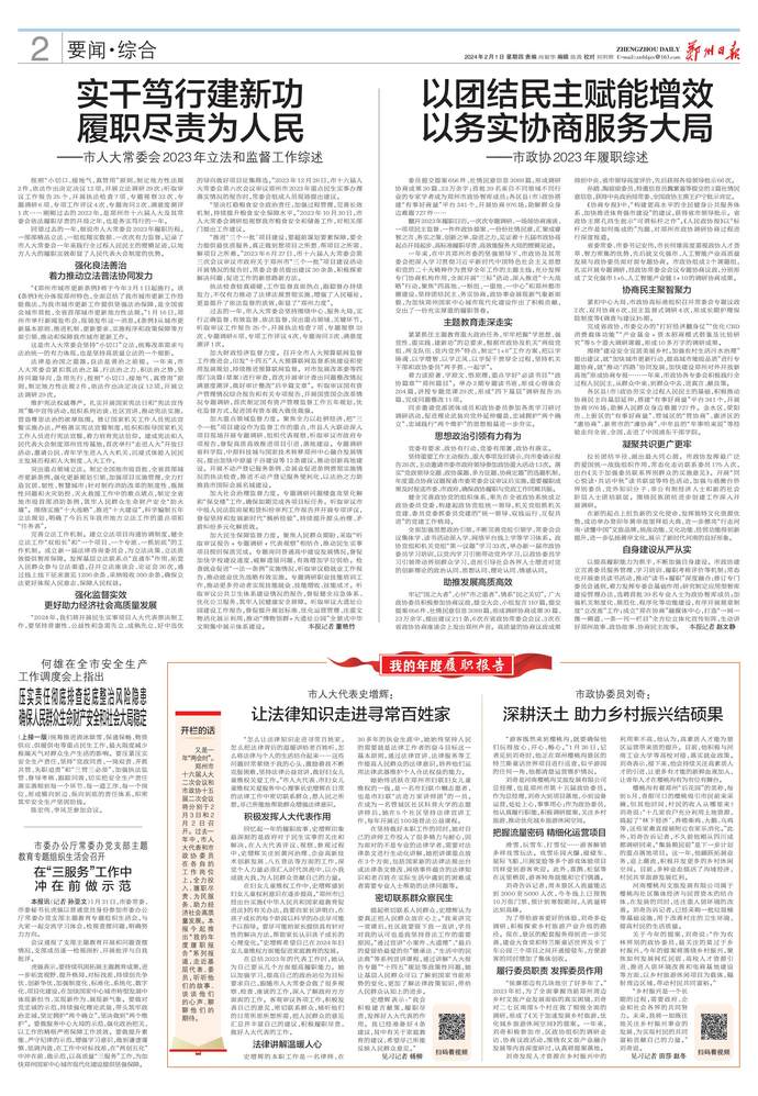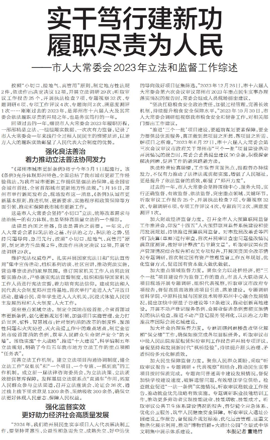 按照“小切口、接地气、真管用”原则,制定地方性法规2件,依法作出决定决议12项,开展立法调研29次;听取审议工作报告25个,开展执法检查7项、专题视察32次、专题调研6项、专项工作评议4次、专题询问2次、满意度测评1次……刚刚过去的2023年,是郑州市十六届人大及其常委会依法履职尽责的开局之年,也是务实笃行的一年。(今日《郑州日报》2版)