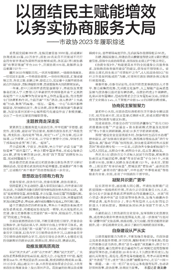 委员提交提案656件、社情民意信息3088篇,形成调研协商成果30篇、23万余字;首批39名来自不同领域不同行业的专家学者成为郑州市政协智库成员;各区县(市)政协搭建“有事好商量”平台341个,开展协商976场,助解群众身边难题727件……(今日《郑州日报》2版)