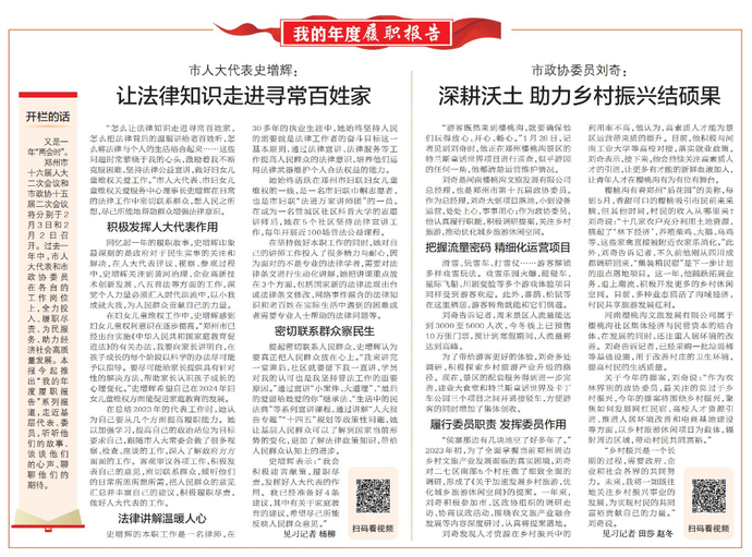 郑州市十六届人大二次会议和市政协十五届二次会议将分别于2月3日和2月2日召开。过去一年中,市人大代表和市政协委员在各自的工作岗位上,全力投入、履职尽责、为民服务、助力经济社会高质量发展。本报今起推出“我的年度履职报告”系列报道,走近基层代表、委员,听听他们的故事、谈谈他们的心声、聊聊他们的期待。
