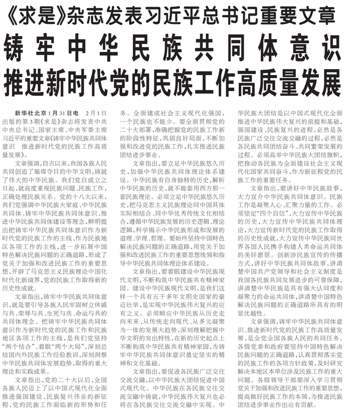2月1日出版的第3期《求是》杂志将发表中共中央总书记、国家主席、中央军委主席习近平的重要文章《铸牢中华民族共同体意识推进新时代党的民族工作高质量发展》。(今日《人民日报》1版)