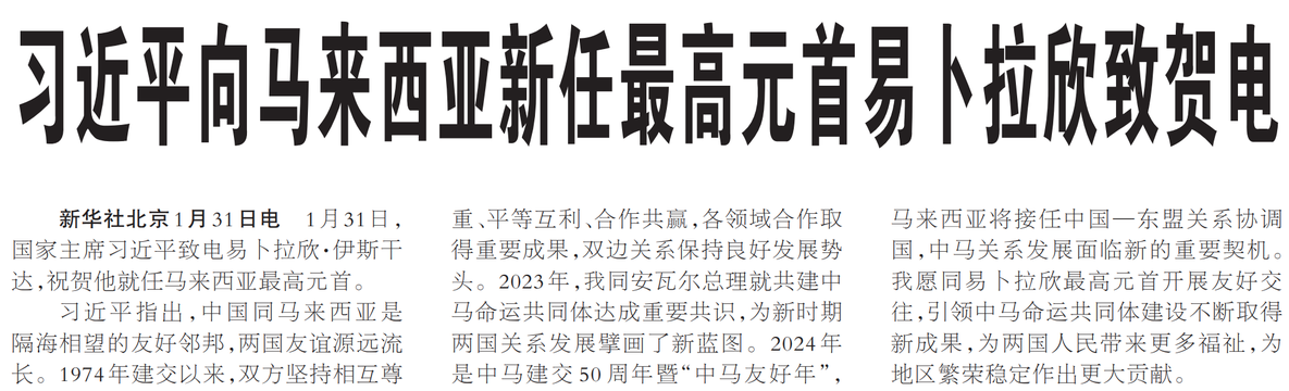 1月31日,国家主席习近平致电易卜拉欣·伊斯干达,祝贺他就任马来西亚最高元首。(今日《人民日报》1版)