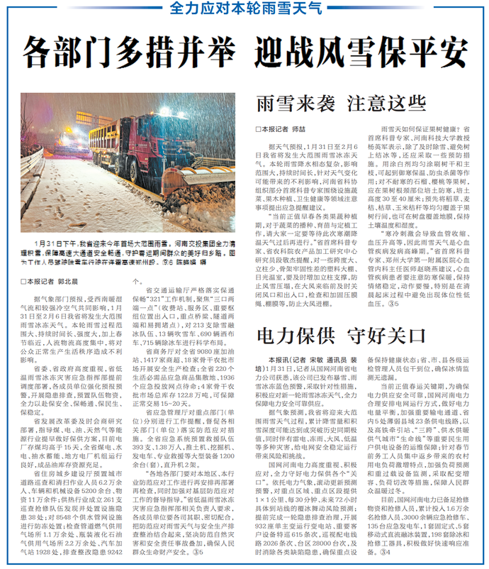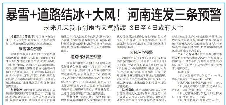 河南省气象台1月31日14时发布暴雪蓝色、道路结冰黄色、大风蓝色预警,提醒大家注意防范。(今日《郑州日报》5版)