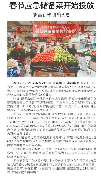 昨日上午,为期5天的郑州市春节应急储备鸡蛋、蔬菜投放工作提前启动。记者走访郑州多家大型超市发现,众多市民纷纷前来选购品质新鲜又价格实惠的应急储备货品。(今日《郑州日报》5版)
