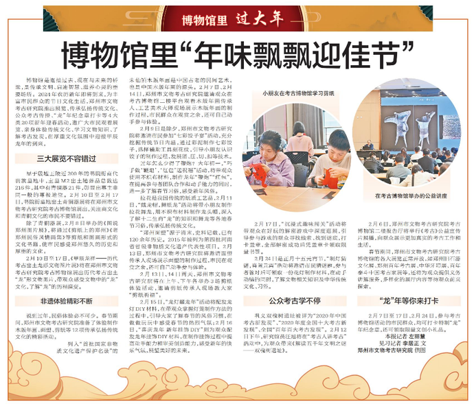 博物馆是连接过去、现在与未来的桥梁,是传承文明、启迪智慧、滋养心灵的重要场所。2024年农历新年即将到来,为丰富市民群众的节日文化生活,郑州市文物考古研究院推出展览、传承弘扬传统文化、公众考古传播、“龙”年纪念章打卡等4大类20项新年迎春活动,邀广大市民观看展览、亲身体验传统文化、学习文物知识、了解考古发现,在厚重文化氛围中迎接甲辰龙年的到来。(今日《郑州日报》7版)