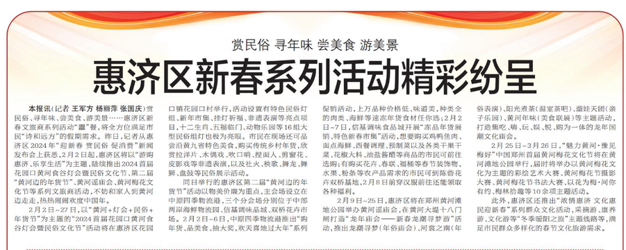 赏民俗、寻年味、尝美食、游美景……惠济区新春文旅商系列活动“龘”餐,将全方位满足市民“诗和远方”的假期需求。昨日,记者从惠济区2024年“迎新春 赏民俗 促消费”新闻发布会上获悉,2月2日起,惠济区将以“游购惠济、乐享生活”为主题,陆续推出2024首届花园口黄河食谷灯会暨民俗文化节、第二届“黄河边的年货节”、黄河谣庙会、黄河梅花文化节等系列文旅商活动,不妨和家人到黄河边走走,热热闹闹欢度中国年。(今日《郑州日报》8版)
