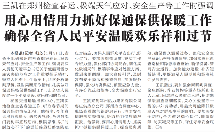 1月31日,省长王凯到郑州市检查指导春运、极端天气应对、安全生产等工作,强调要深入贯彻习近平总书记关于低温雨雪冰冻灾害防范应对工作重要指示精神,坚持人民至上、生命至上,科学分析研判形势,及时果断采取措施,扎实做好保通保畅保供保暖工作,让全省人民度过一个平安温暖、欢乐祥和的节日。(今日《河南日报》1版、4版)