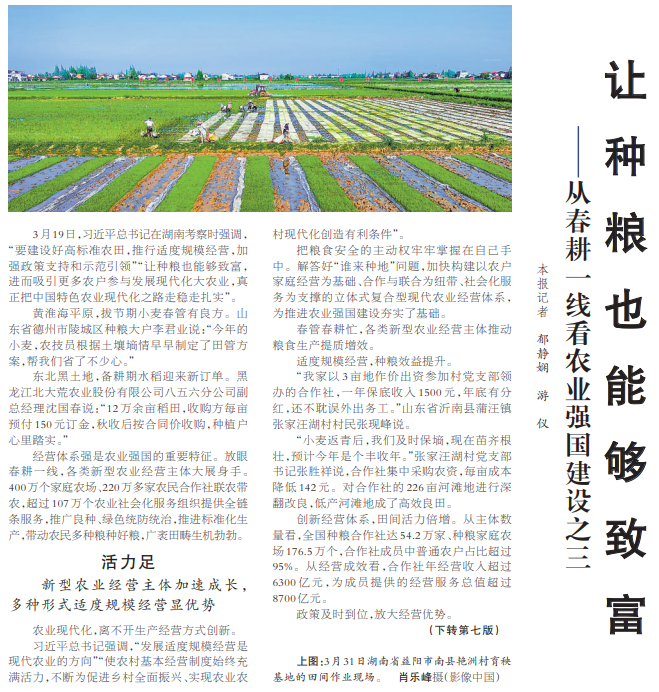 3月19日,习近平总书记在湖南考察时强调,“要建设好高标准农田,推行适度规模经营,加强政策支持和示范引领”“让种粮也能够致富,进而吸引更多农户参与发展现代化大农业,真正把中国特色农业现代化之路走稳走扎实”。