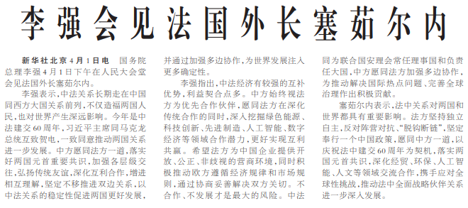 国务院总理李强4月1日下午在人民大会堂会见法国外长塞茹尔内。(今日《人民日报》1版)