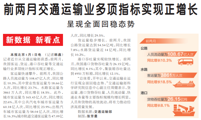 记者近日从交通运输部获悉:前两月,我国客运、货运、港口吞吐量等交通运输行业多项统计指标实现正增长。(今日《人民日报》1版)