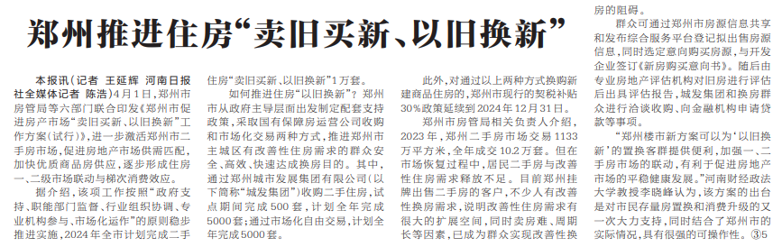 4月1日,郑州市房管局等六部门联合印发《郑州市促进房产市场“卖旧买新、以旧换新”工作方案(试行)》,进一步激活郑州市二手房市场,促进房地产市场供需匹配,加快优质商品房供应,逐步形成住房一、二级市场联动与梯次消费效应。(今日《河南日报》1版)