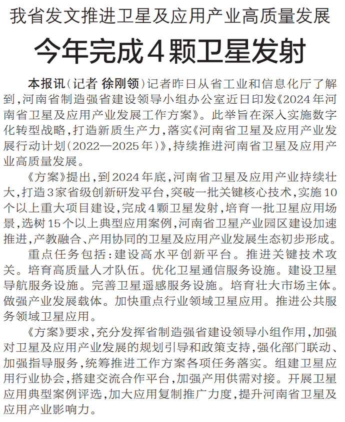 记者昨日从省工业和信息化厅了解到,河南省制造强省建设领导小组办公室近日印发《2024年河南省卫星及应用产业发展工作方案》。此举旨在深入实施数字化转型战略,打造新质生产力,落实《河南省卫星及应用产业发展行动计划(2022—2025年)》,持续推进河南省卫星及应用产业高质量发展。(今日《郑州日报》1版)