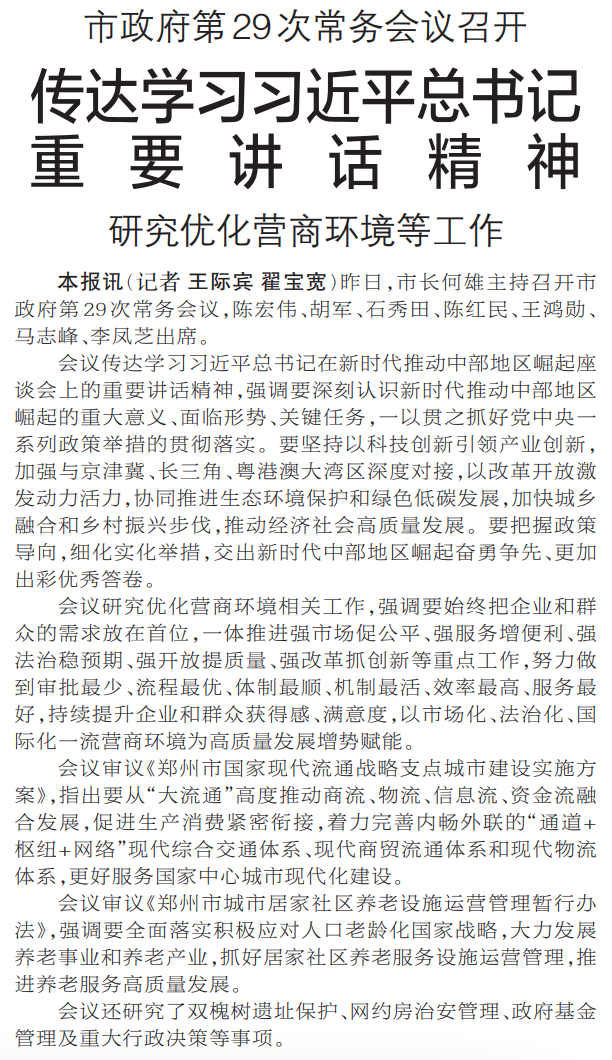 昨日,市长何雄主持召开市政府第29次常务会议,陈宏伟、胡军、石秀田、陈红民、王鸿勋、马志峰、李凤芝出席。(今日《郑州日报》1版)