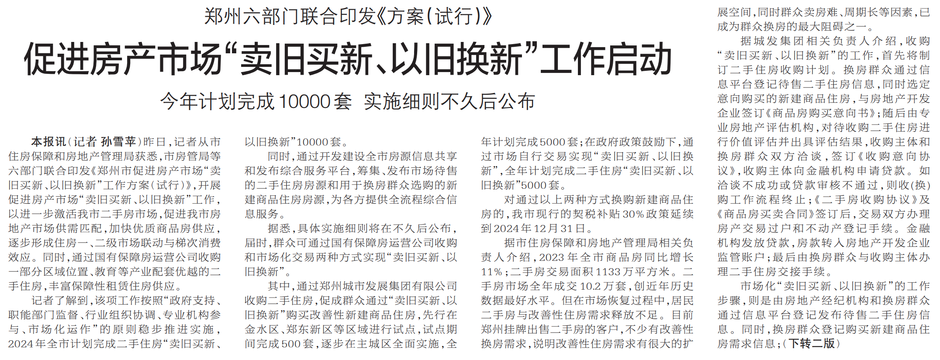 昨日,记者从市住房保障和房地产管理局获悉,市房管局等六部门联合印发《郑州市促进房产市场“卖旧买新、以旧换新”工作方案(试行)》,开展促进房产市场“卖旧买新、以旧换新”工作,以进一步激活我市二手房市场,促进我市房地产市场供需匹配,加快优质商品房供应,逐步形成住房一、二级市场联动与梯次消费效应。同时,通过国有保障房运营公司收购一部分区域位置、教育等产业配套优越的二手住房,丰富保障性租赁住房供应。(今日《郑州日报》1版、2版)
